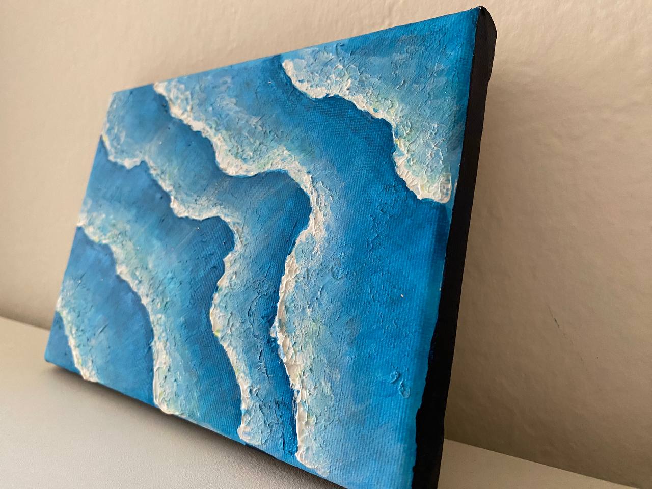 This small-scale abstract work captures the gentle movement and rhythm of ocean waves through layered texture and tonal variation. Raised, flowing forms in white and pale blue emerge from a deeper blue ground, evoking the natural patterns of water in motion. The tactile surface enhances the sense of depth and fluidity, encouraging close viewing. Despite its intimate size, the piece conveys expansiveness and calm, reflecting the quiet, meditative energy of the sea.